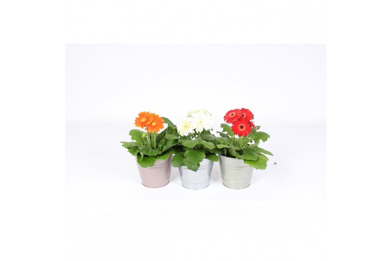 Gerbera mix Gerbera 2+bl 12cm in metallic zinken pot 3 ass 2 bl.