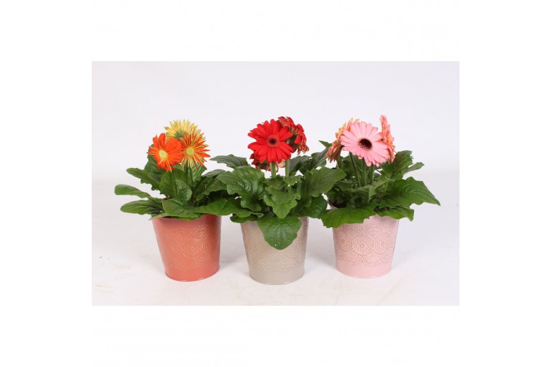 Gerbera mix Gerbera belicht 2+ in zink pot in romance zink 3 ass. 2 bl