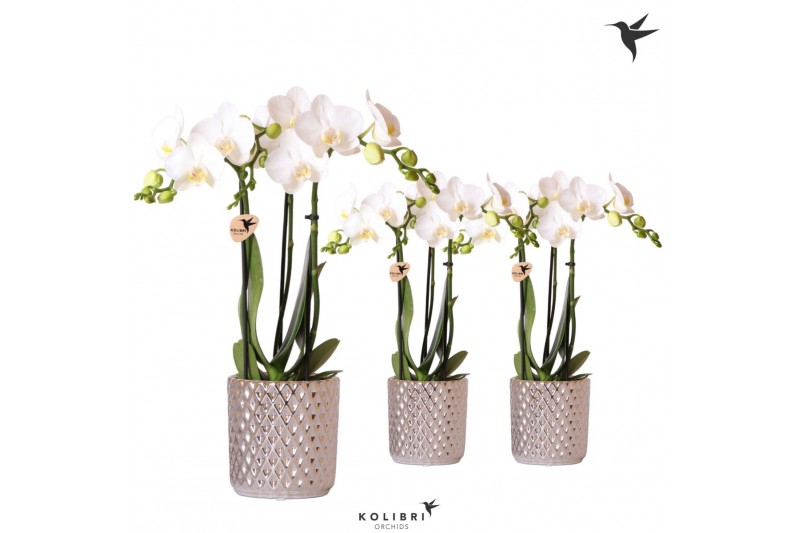Phalaenopsis multiflora wit Kolibri Orchids 3 tak in Diamond pot silve
