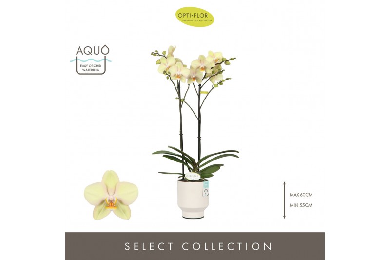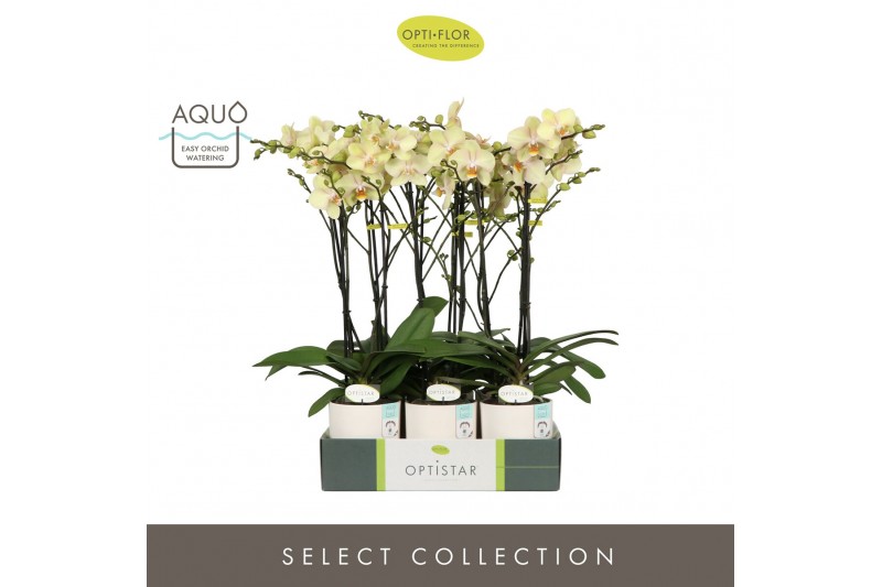 Phalaenopsis geel Optistar Shakira 2 spike in Emilia White Aquo 15 bl.