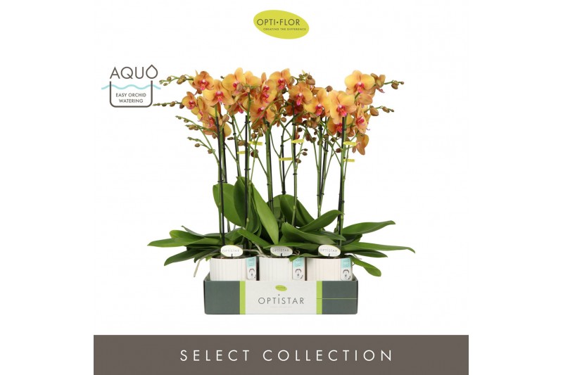 Phalaenopsis oranje Optistar Deshi 2 spike in Molise White Aquo 15 bl.