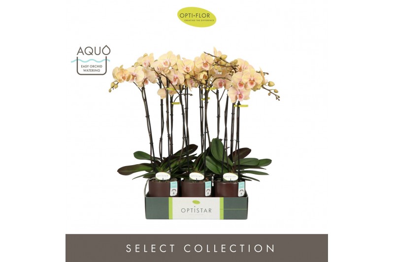 Phalaenopsis geel Optistar Parton 2 spike in Emilia Brown Aquo15 bl. 2