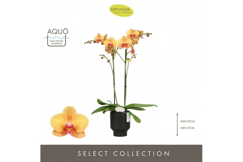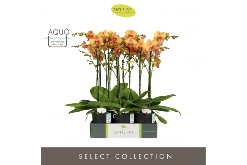 Phalaenopsis oranje Optistar Deshi 2 spike in Emilia Brown Aquo 15 bl.