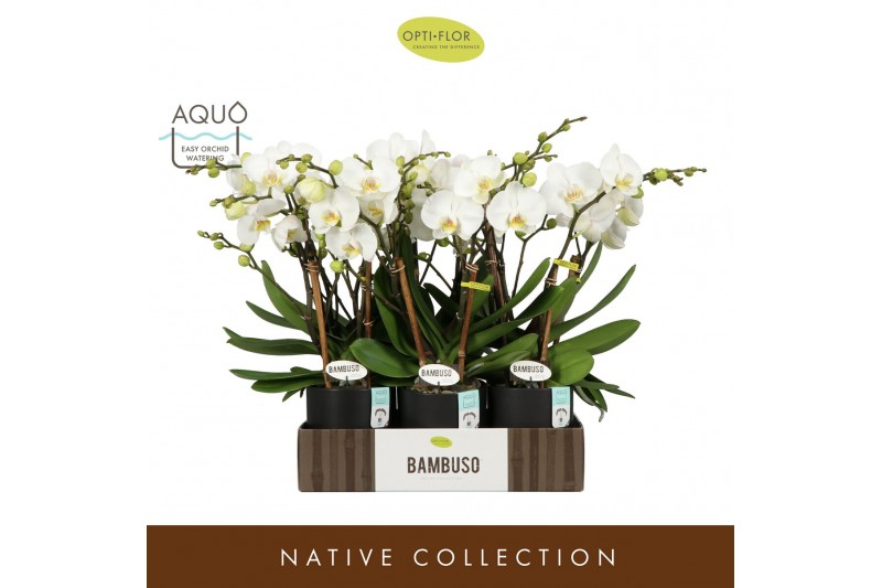 Phalaenopsis wit Bambuso Inyo 2 spike in Emilia Brown Aquo 30 bl. 2 ta