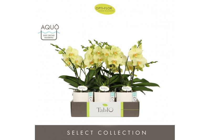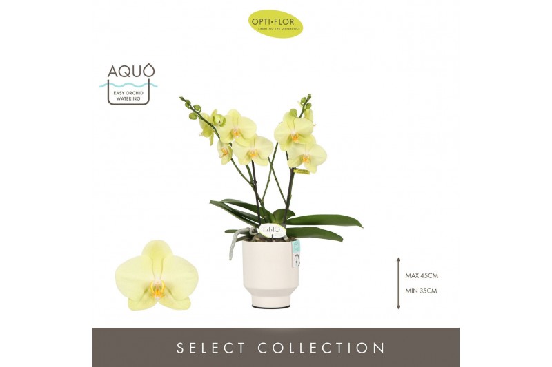 Phalaenopsis geel Tablo Limoncello 2 spike in Emilia White Aquo 25 bl.