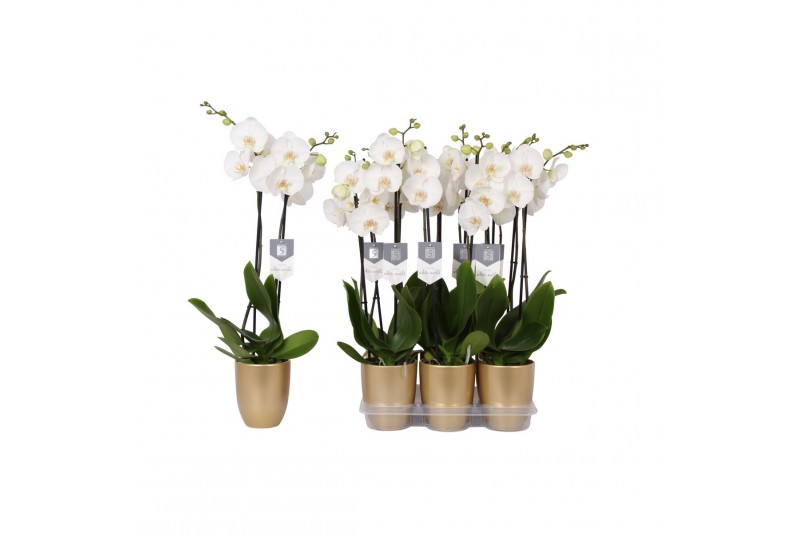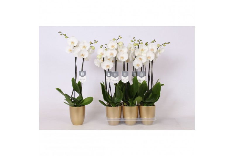 Phalaenopsis white world 2 tak - 14+ bloemen goud keramiek