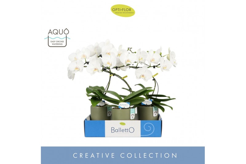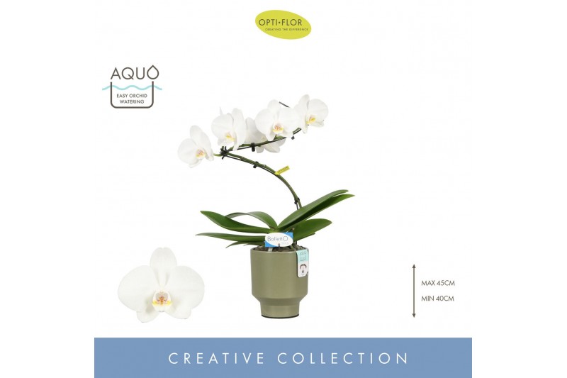 Phalaenopsis wit Balletto Wing 1 spike in Emilia Green Aquo 9 bl. 1 ta
