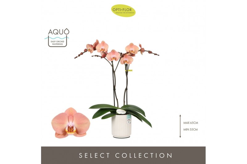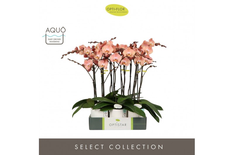 Phalaenopsis oranje Optistar Suki 2 spike in Molise White Aquo 15 bl.