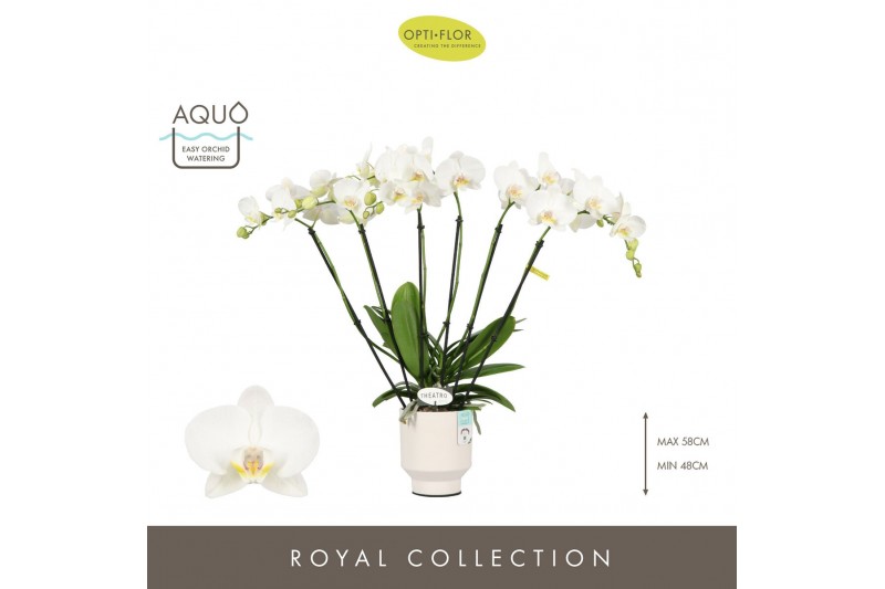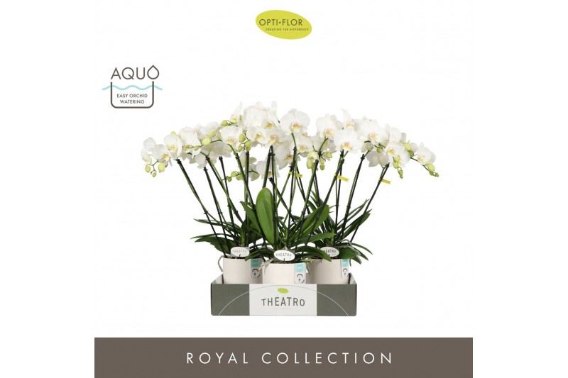 Phalaenopsis wit Theatro Jazz 6 spike in Emilia White Aquo 45 bl. 6 ta
