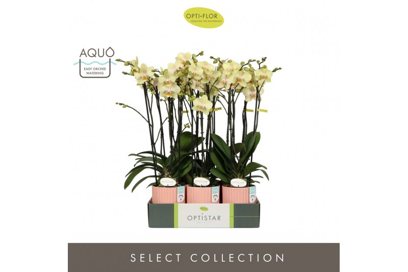Phalaenopsis geel Optistar Shakira 3 spike in Molise Salmon Aquo 18 bl